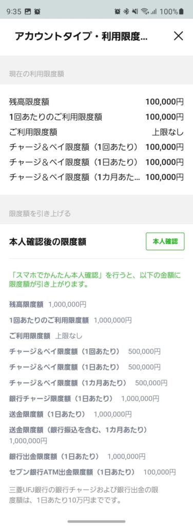 - 本人確認作業してから4時間後に確認完了連絡が来て、上限緩和されました